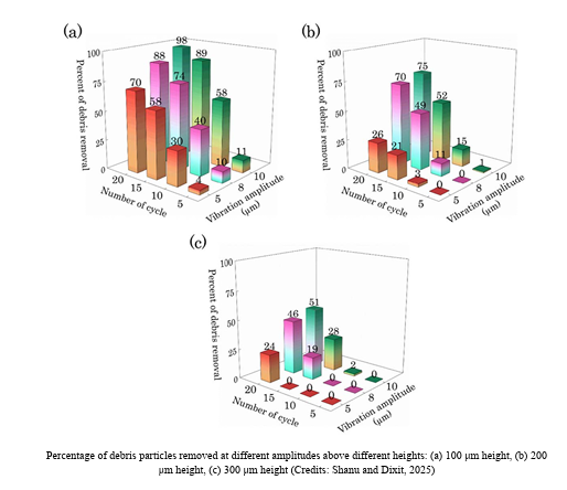 The simulation results, as shown in the figure above, demonstrate that stronger ultrasonic vibrations flush out debris with varying efficiency at different amplitudes. When the tool vibrated at higher amplitudes (around 8–10 micrometres), nearly all debris particles were cleared within a few vibration cycles, even from deep inside the microholes. At lower amplitudes, debris tended to linger and clog the gap. However, the gains tapered off beyond a certain vibration strength, suggesting there’s an optimal level at which debris removal is maximised without over-agitating the system.