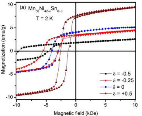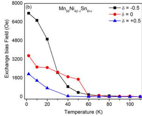 Figure (1) The shifted magnetic hysteresis (M-H) loops to negative field direction (opposite to field cooling (FC) direction) illustrating the exchange bias effect in Mn50Ni42-δSn8+δ (δ = 0, −0.25 and ±0.5) Heusler alloys measured at 2 K after FC process at 10 kOe (2) temperature dependence of EB field (HEB) in these alloys after FC at 10 kOe.