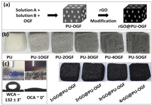 Figure (1a) Schematic presentation for synthesis of Graphome (rGO@PU-OGF) foam, (1b) As-syntehsized foams with variation in OGF and rGO amounts, (1c) Photograph of water droplet and motor oil droplet with contact angle on rGO@PU-OGF foam surface; (2) Depicts a Raman spectra of pristine PU foam, nanocomposite foam (PU-OGF), surface modified nanocomposite foam (rGO@PU-OGF)
