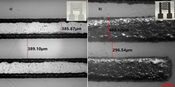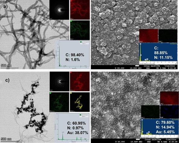 Figure (1) Schematic of experimental setup and sensor preparation, (1a) Experimental setup using SPCE substrate, (1b) Substrate preparation and immobilization process for immunosensing; (2) Stencil printed carbon interdigitated microelectrode, (2a) Optical microscope image of stencil fabricated on PET sheet. Inset: Image of stencil on PET sheet, (2b) Optical microscope image of carbon electrodes on PET sheet; Inset: Image of electrodes on PET sheet; (3) Electron microscopic images of SPCE substrate, (3a) Field Emission Gun TEM (FEGTEM) micrograph of polyaniline which forms a thread like structure after polymerisation, (3a Inset) Diffraction pattern denoting amorphous nature, (3b) FEGSEM micrograph of polyaniline deposited over the carbon electrodes. The EDAX mapping for image set a and b shows the presence of nitrogen (N), indicating polyaniline, which has amines, (3c) TEM image of CGNPs embedded in polyaniline, (3c inset) Diffraction pattern indicating the crystalline nature, (3d) Image of the carbon electrode surface when CGNPs embedded within polyaniline were deposited over it. The EDAX mapping for image set c and d shows the presence of nitrogen (N) and gold (Au), indicating polyaniline and gold nanoparticles; (4) Initial studies done on potentiostat, (4a) Impedance change during the functionalisation steps of the substrate, (4b) Relative change in impedance with respect to baseline for Microcystin-LR (MCLR) in PBS, (4c) Calibration curve generated for MCLR in PBS, (4d) Responses for different interfering species for 1 ppm of concentration.