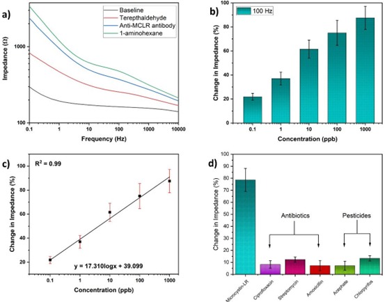 - Sensitive Detection Mechanism: Employs electrochemical impedance spectroscopy (EIS) for accurate detection of microcystin-LR in the ppb range.