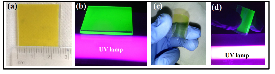 Figure (1a) Schematic diagram of single source thermal vapour deposition of MAPbX3 NPs, digital images of (1b) MAPbBr3 nanoparticle powder and (1c) as deposited MAPbBr3 thin film; (2a) XRD spectra of the MAPbBr3 thin film compared with MAPbBr3 NPs, and ICSD (252415) database of MAPbBr3, (2b) UV-vis absorption and photoluminescence (PL) spectra of MAPbBr3 NPs (green), and MAPbBr3 thin films (red); (3) MAPbBr3 thin films (3a) and (3b) on 1" × 1" glass substrate, (3c) and (3d) on flexible substrate. Fig. (3a) and (3c) show the as-deposited thin films under white light whereas fig. (3b) and (3d) show the emissive nature of the thin films under UV light.