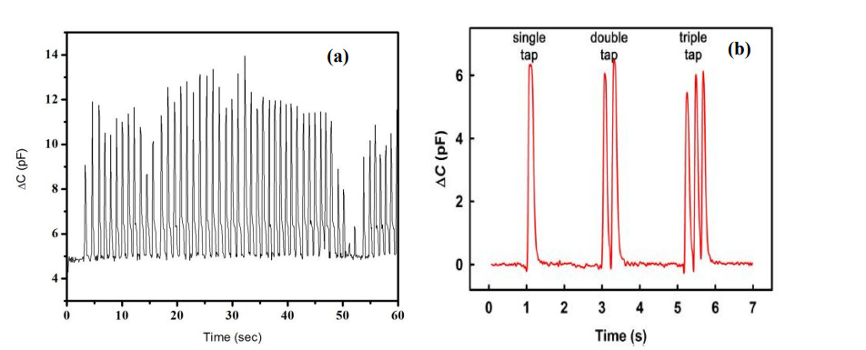 Figure (1) Schematic of experiment for this invention; (2) Pressure sensing device illustrating the proposed porous PDMS film as dielectric medium in the parallel plate capacitor; (3a) Change in capacitance of the parallel plate capacitor pressure sensor device, (3b) Reported change in capacitance of a similar configuration using porogen mediated porous PDMS. The change in capacitance with applied strokes of pressure with real time variation showing minimum response time giving ∆C/Co ~ 1.6 which is double of that reported in fig. (3b).