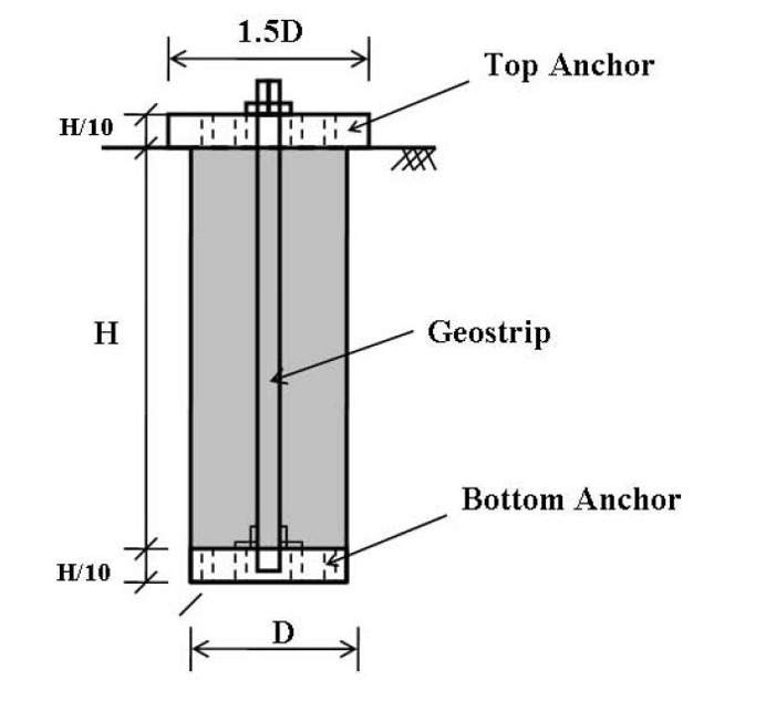 - High-Tensile Reinforcing Tie: A flexible geocompatible tie (e.g., geostrips) runs through the column and is tautly fixed between the anchors.