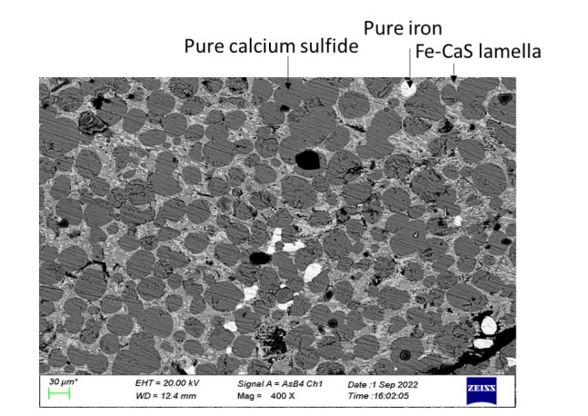 - Composite with Integrated CaS Microparticles: The material includes free CaS particles (10–100 µm), free iron, and a Fe–CaS network structure containing uniformly embedded CaS microparticles (1–20 µm).