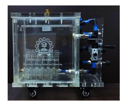 The prototype consists of a modular atomizer assembly featuring a control panel, a sealed atomization chamber, and a manifold-fed nozzle unit. The atomization unit comprises a brass nozzle block housing two micropipette tubes of different lengths, arranged in a tapered tube-in-tube configuration. These tubes deliver compressed air and liquid to a centrally positioned impactor plate within the chamber. The setup includes a bypass air line, rotameters, pressure regulators, and a two-way valve for directing airflow and maintaining continuous operation. The atomization chamber is made of acrylic with stainless steel connectors and a top-mounted drainage pipe. The prototype was tested with salt solutions at pressures ranging from 15 to 90 psi and validated using Mie scattering to confirm stable droplet formation and narrow size distribution.