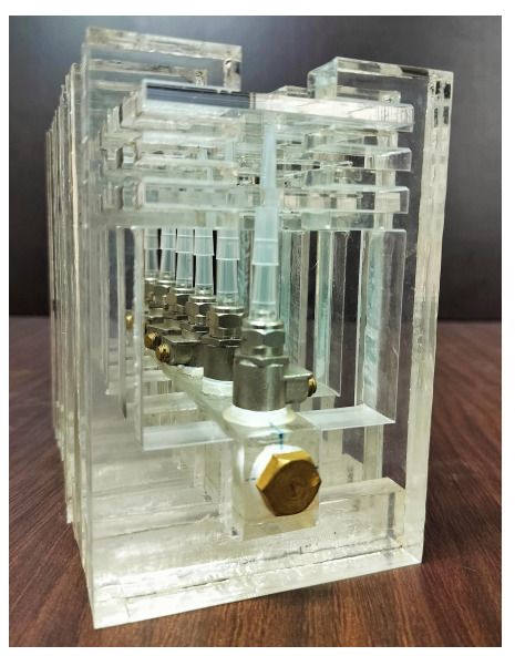 - Modular Supply Architecture: The design connects multiple nozzles to a common manifold through individual flexible tubing, allowing easy scalability and reconfiguration for multi-nozzle operation.