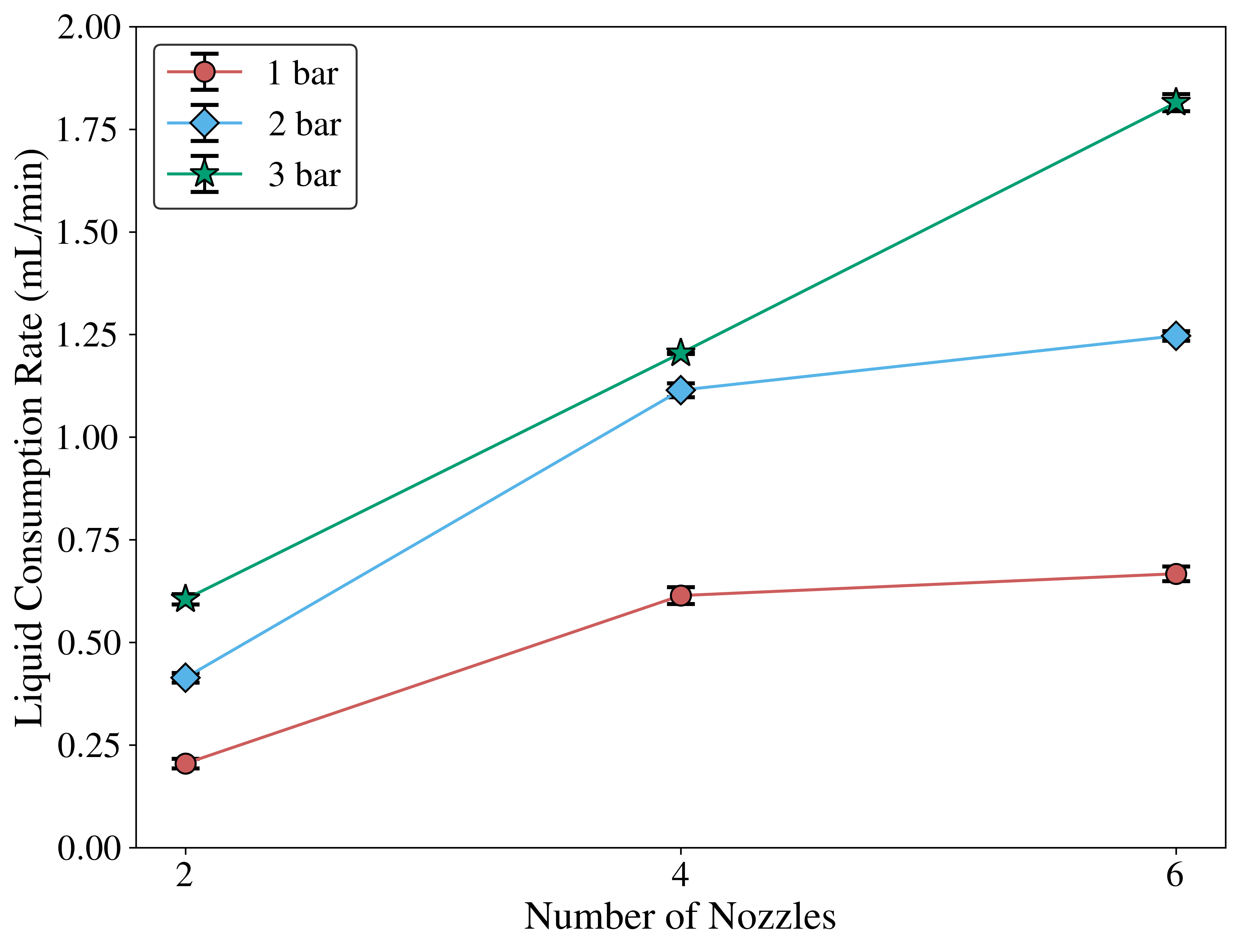 Figure (1) Atomiser – Front view; (2) Atomisation assembly; (3) Atomiser; (4) Under nominal laboratory conditions, using water as the atomizing medium, the atomizer assembly — equipped with four identical nozzles and supplied at 2 bar gauge air pressure — exhibited a liquid consumption rate of 1.11 mL/min (see Figure). Refer to the accompanying plot for the complete consumption‐rate profile across varying nozzle counts and supply pressures.